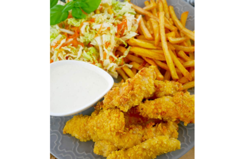 kotlet z dorsza/ cheddar/ krążki cebulowe/ pikle/ konfitura z cebuli/ panierowany boczniak/ pomidory/ fryty