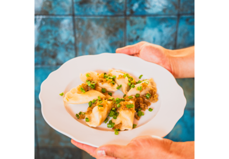 Bao z szarpaną wieprzowiną/ karmelizowana cebulka/ mayo bbq/ zielenina/ julienne/ sezam